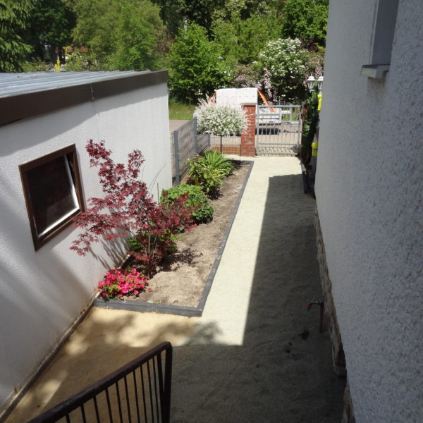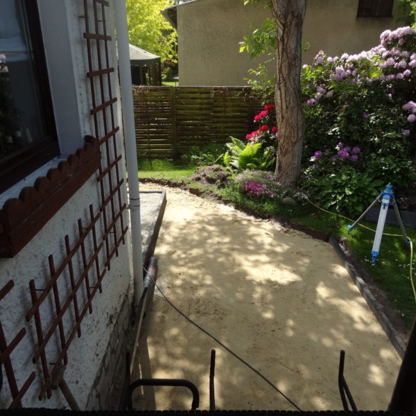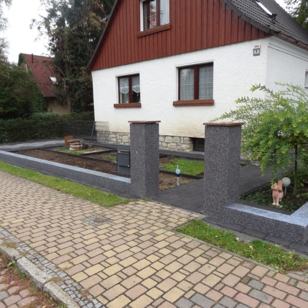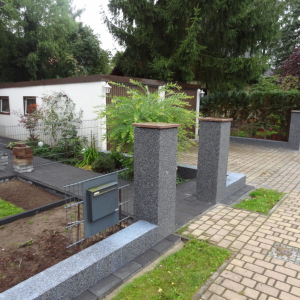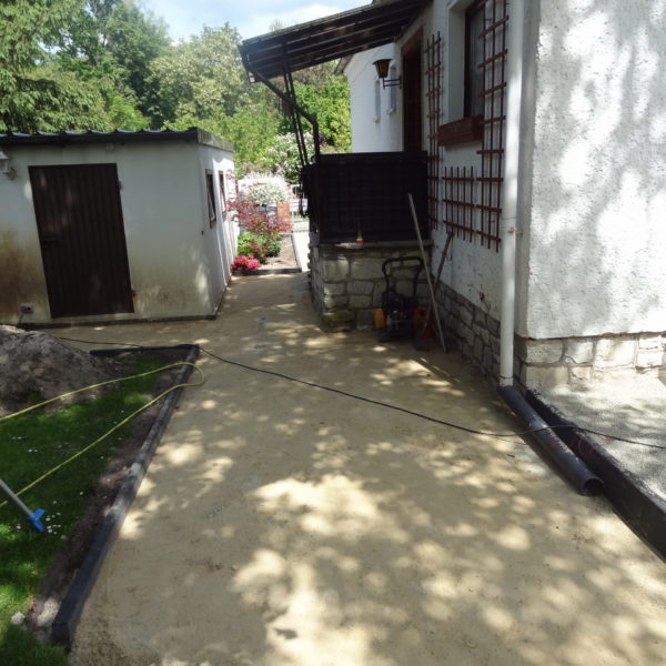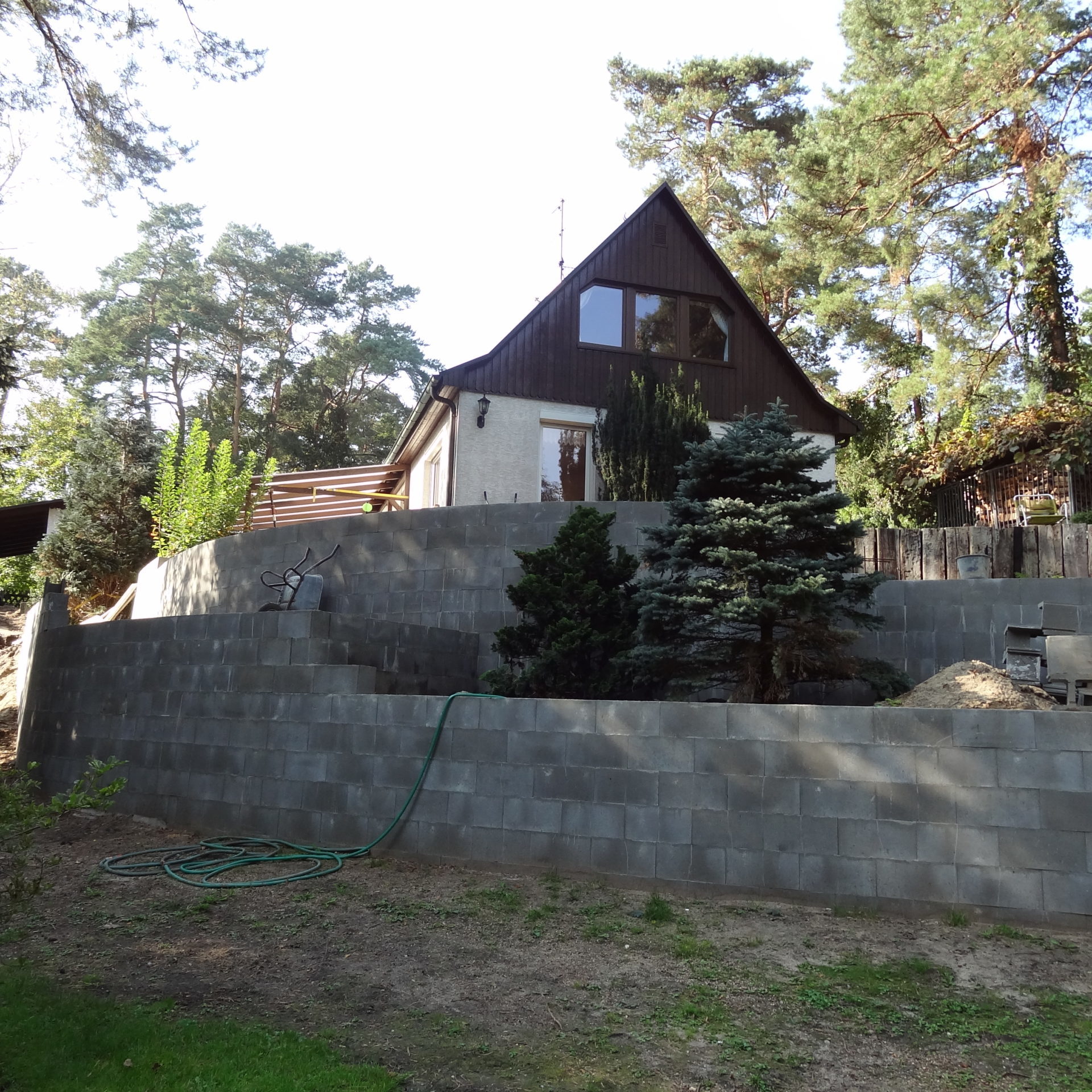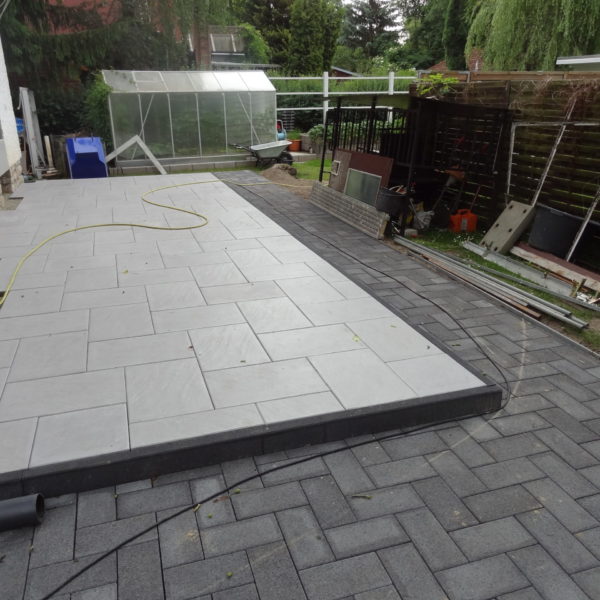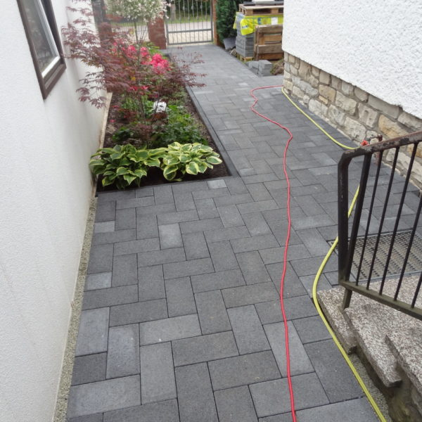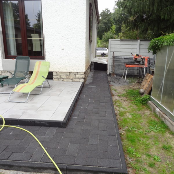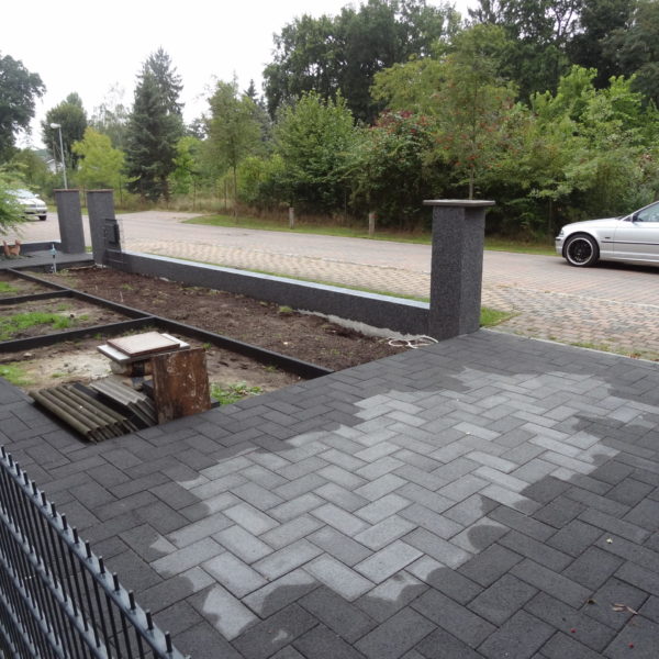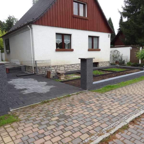 Angefallene Arbeiten: Außenanlage pflastern Umsetzen eines Kellereinganges Terrasse anlegen mit Terrassenplatten Mauer setzen, verputzen Zaunpfosten mauern, verputzen Project navigationNextNext project:Außenanlage pflastern