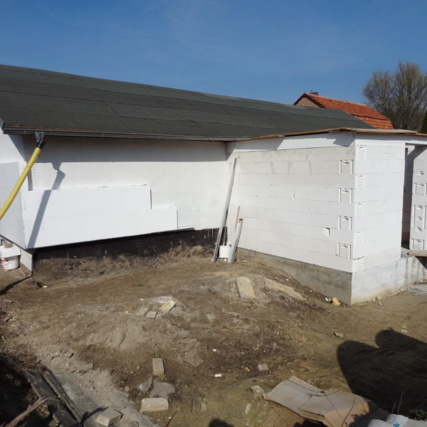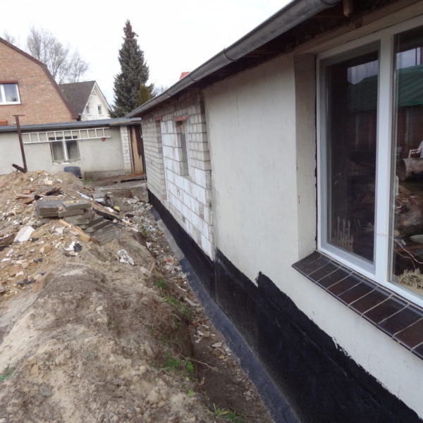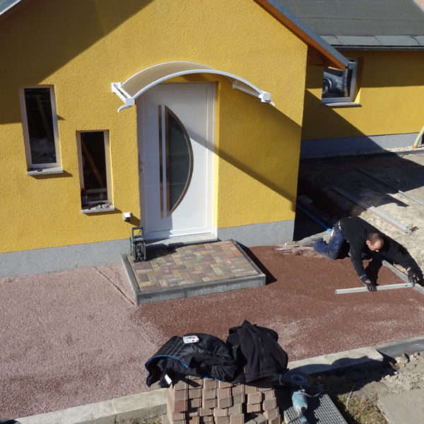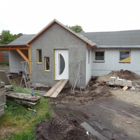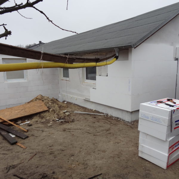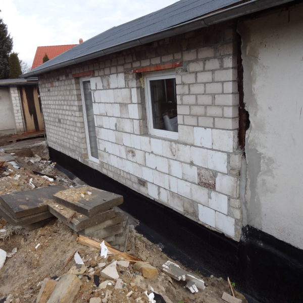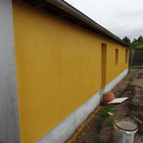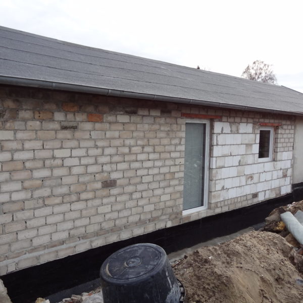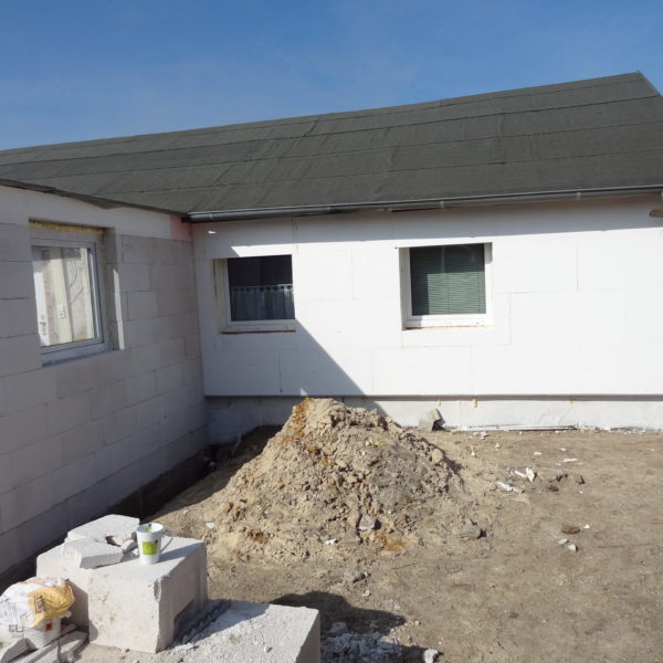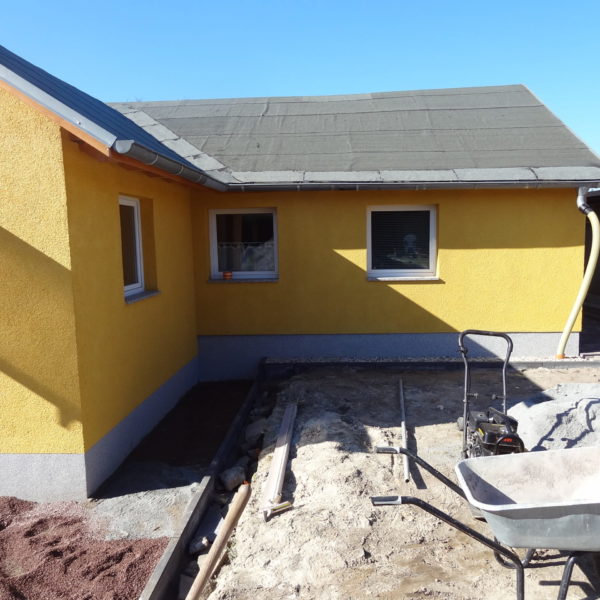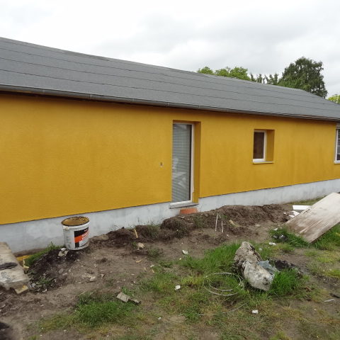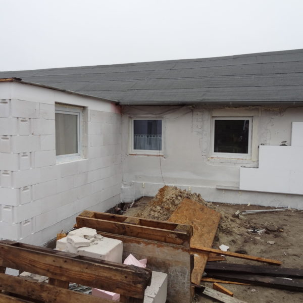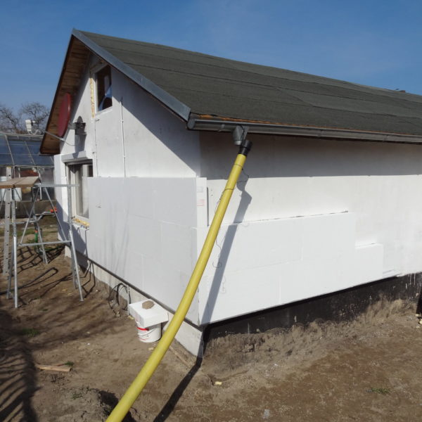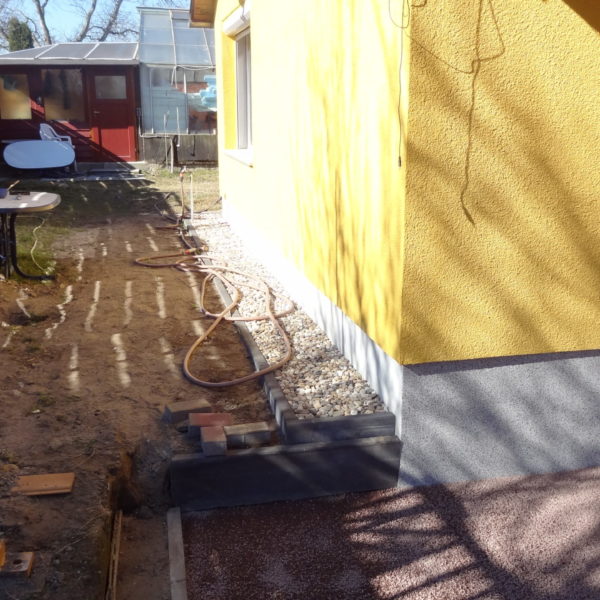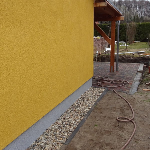 Angefallene Arbeiten: Haus isolieren mit Bitumen Eingangsbereich mauern Eingangsbereich Dach setzen Haus dämmen Haus außen verputzen Haus streichen Kieselbett um das Haus anlegen Außenanlage pflastern Eingangsbereich Absatz setzen Project navigationNextNext project:Außenanlage pflastern