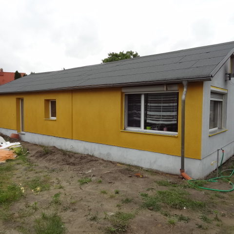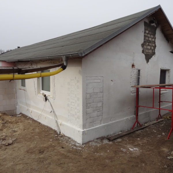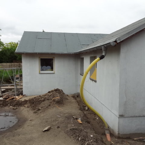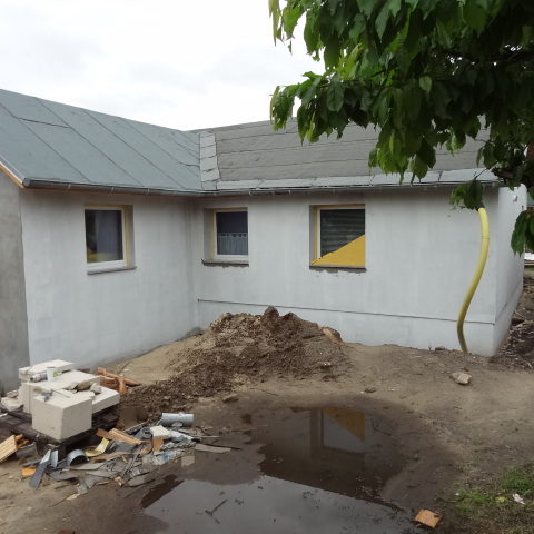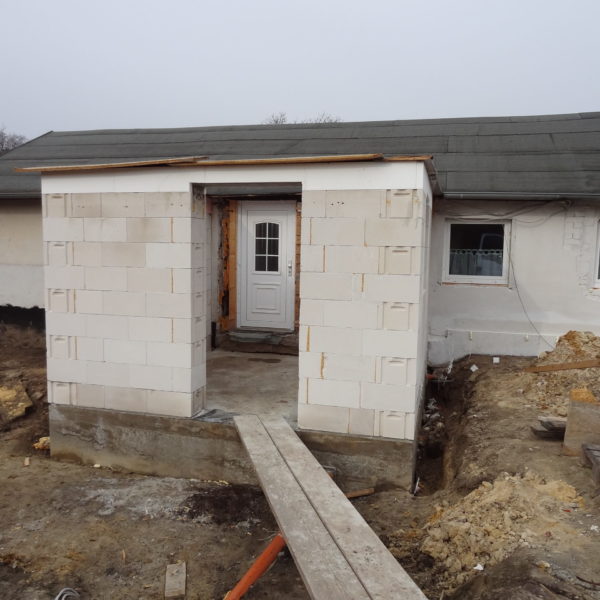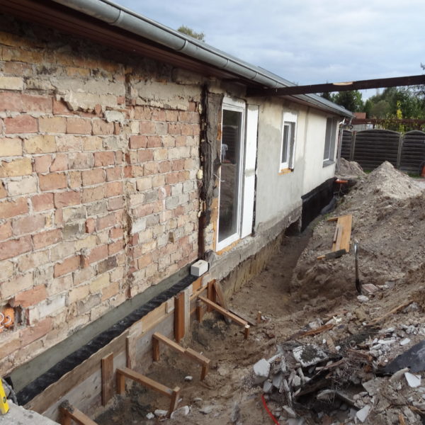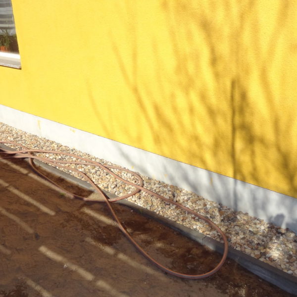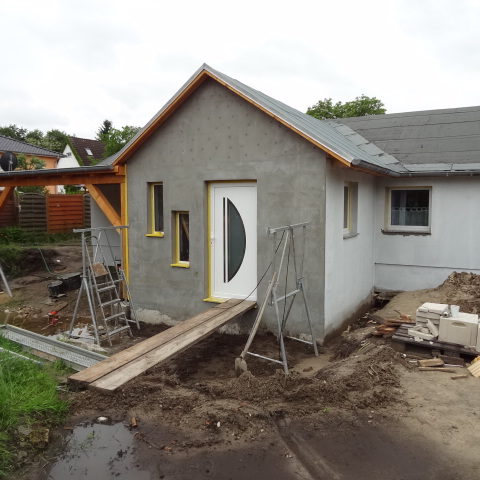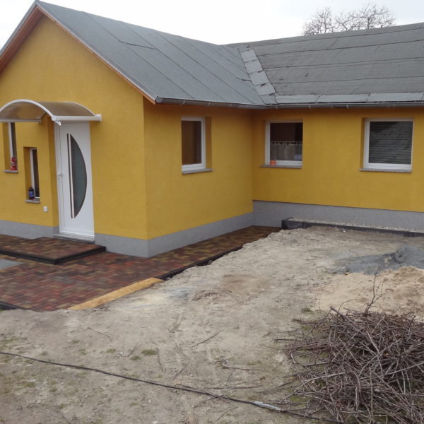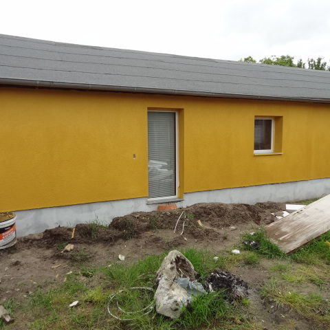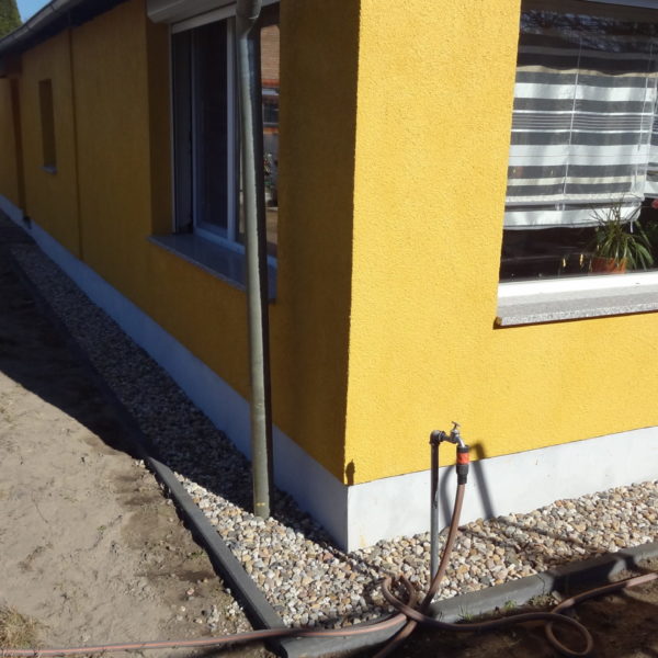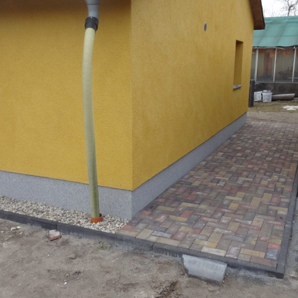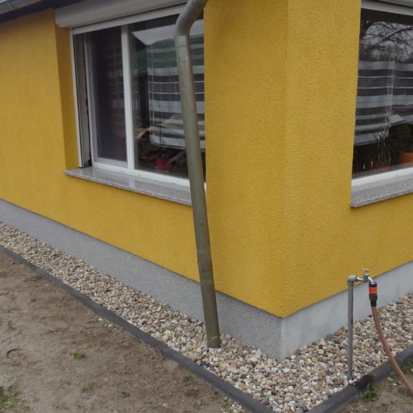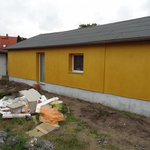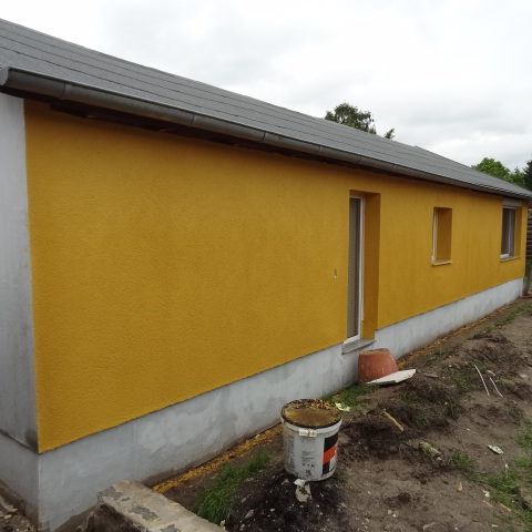 Angefallene Arbeiten: Haus isolieren mit Bitumen Eingangsbereich mauern Eingangsbereich Dach setzen Haus dämmen Haus außen verputzen Haus streichen Kieselbett um das Haus anlegen Außenanlage pflastern Eingangsbereich Absatz setzen Project navigationNextNext project:Außenanlage pflastern