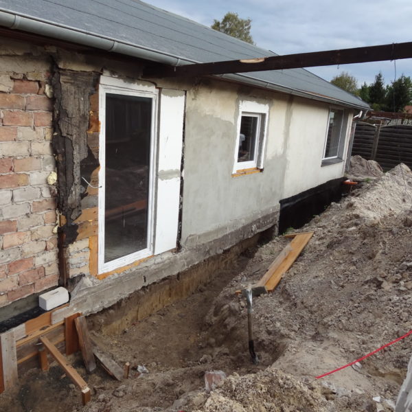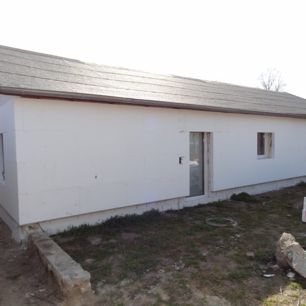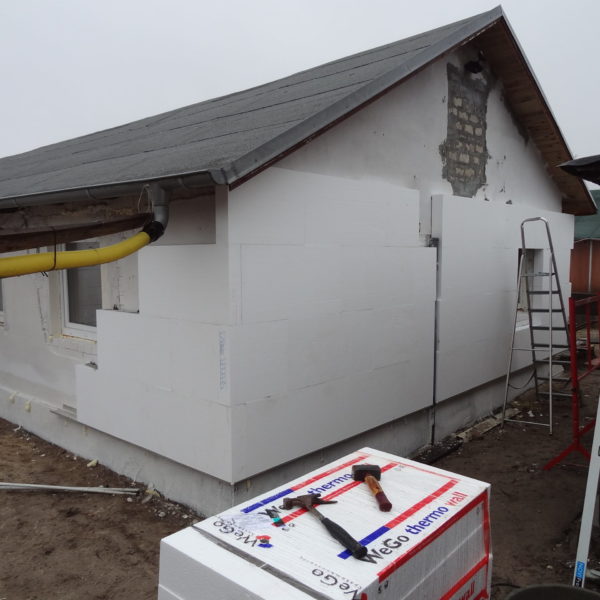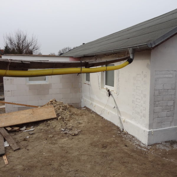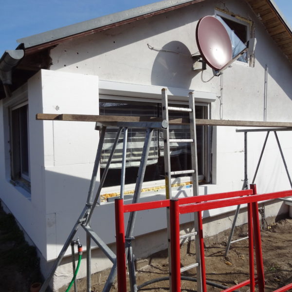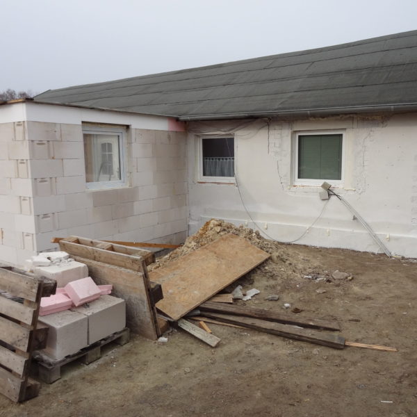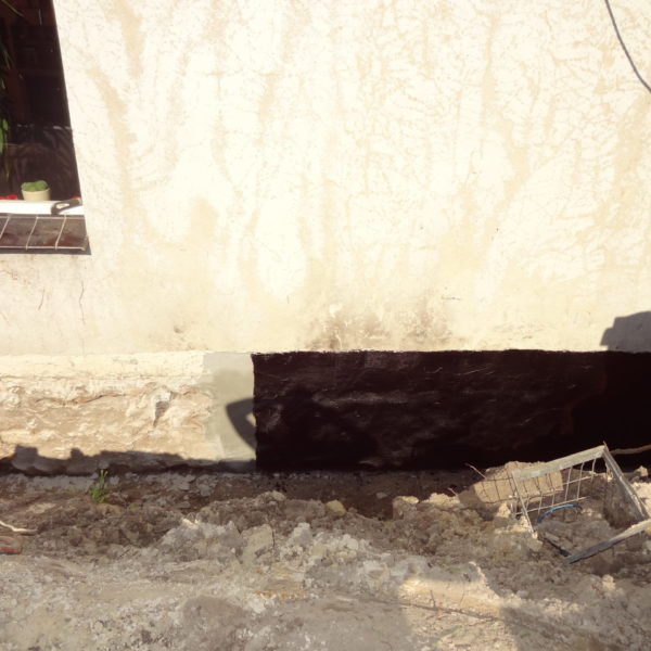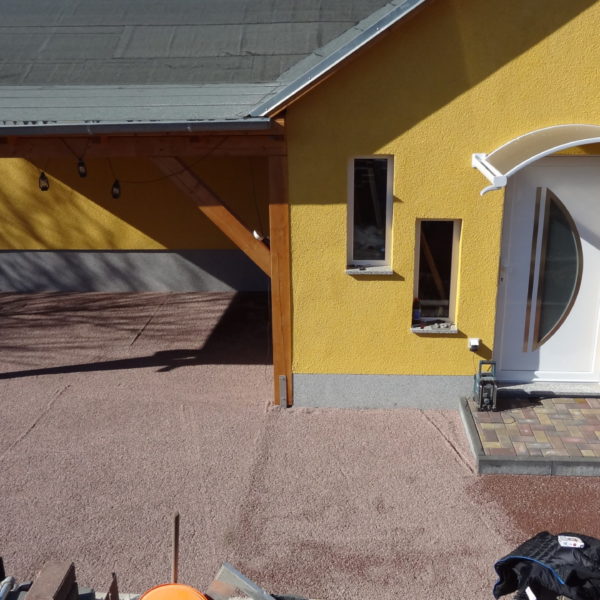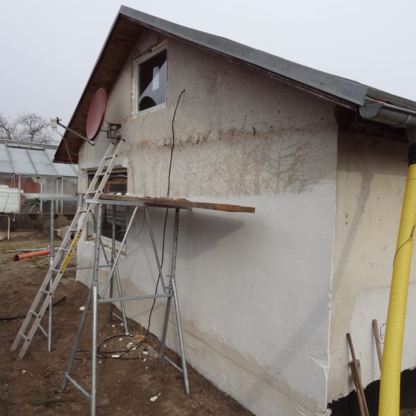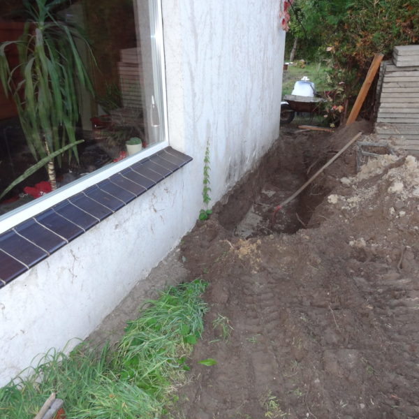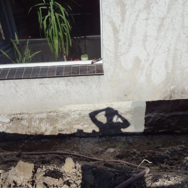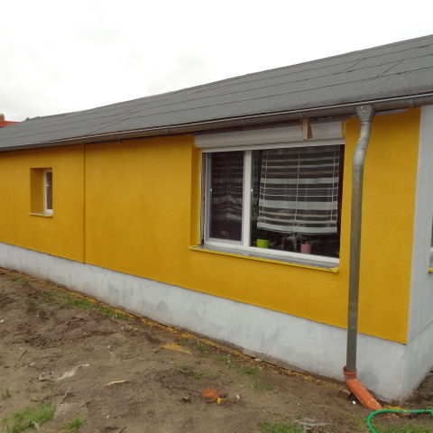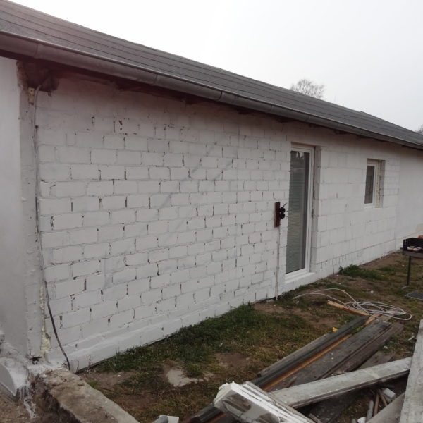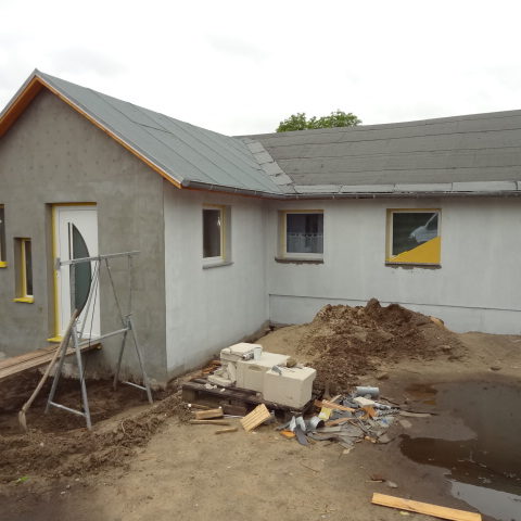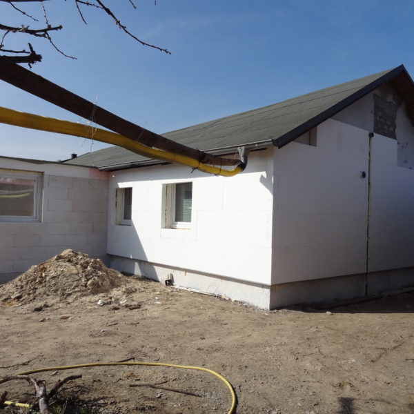 Angefallene Arbeiten: Haus isolieren mit Bitumen Eingangsbereich mauern Eingangsbereich Dach setzen Haus dämmen Haus außen verputzen Haus streichen Kieselbett um das Haus anlegen Außenanlage pflastern Eingangsbereich Absatz setzen Project navigationNextNext project:Außenanlage pflastern
