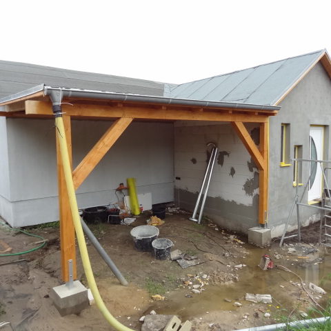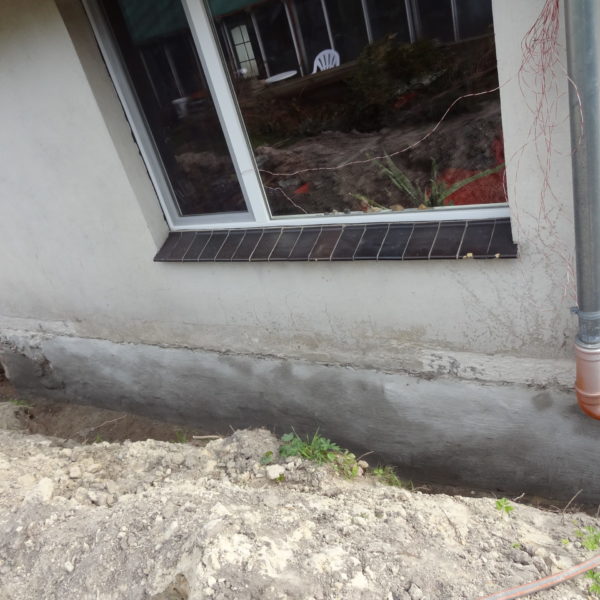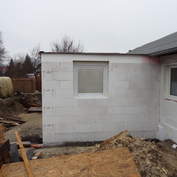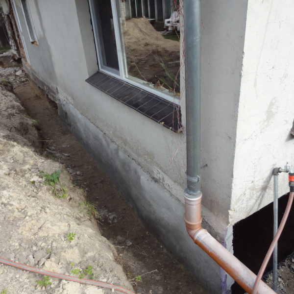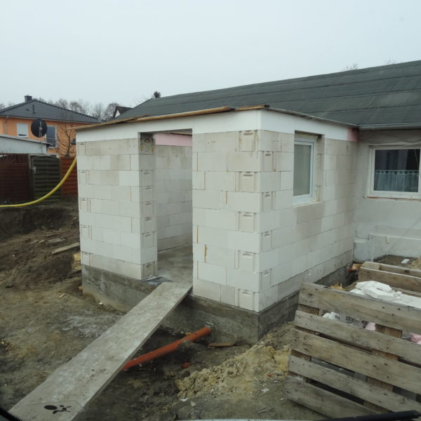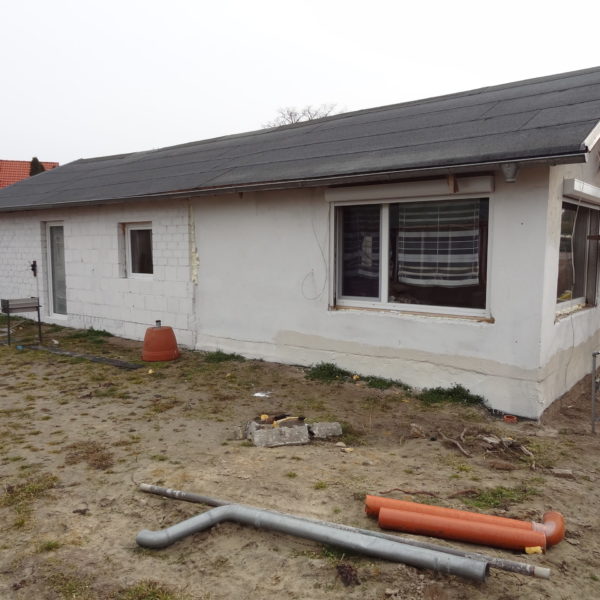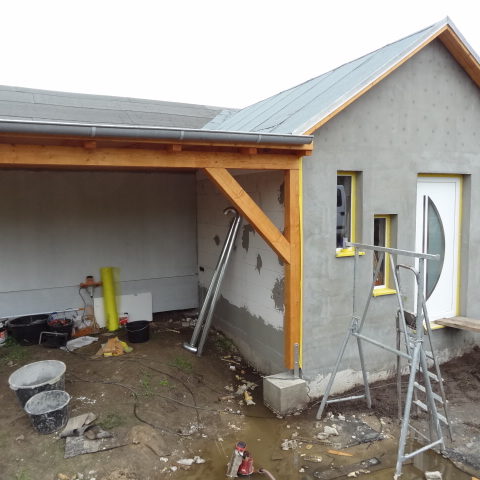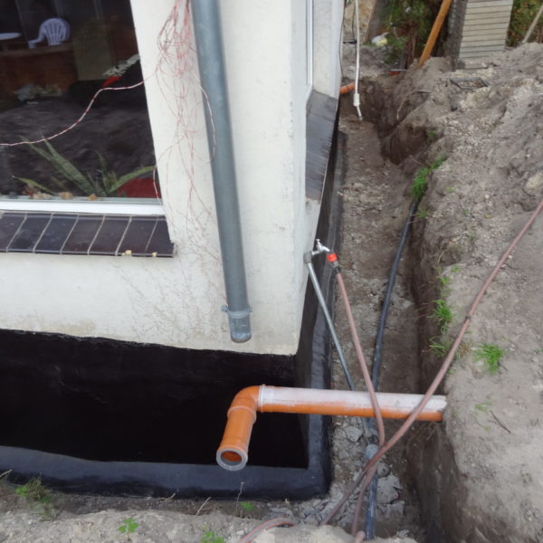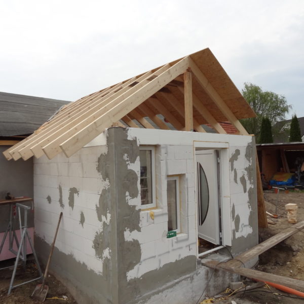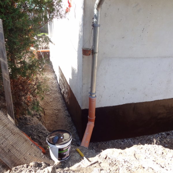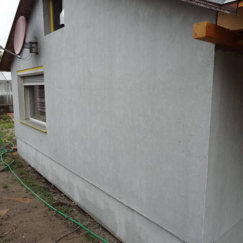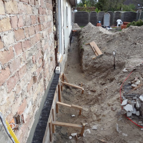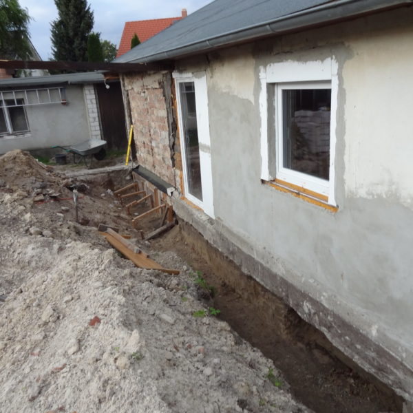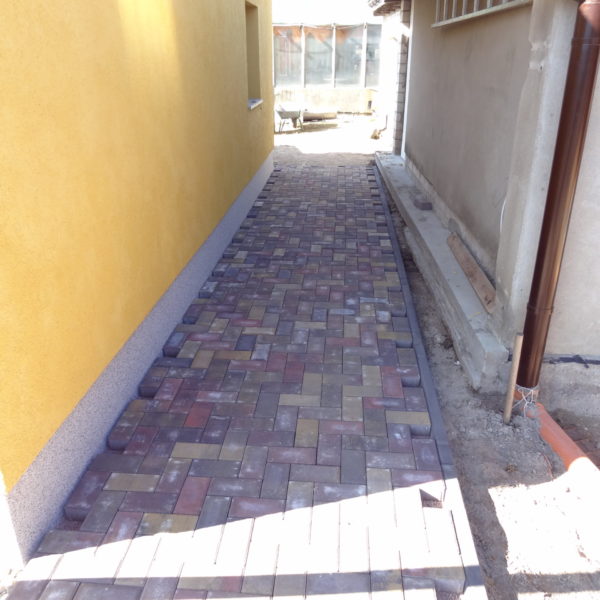 Angefallene Arbeiten: Haus isolieren mit Bitumen Eingangsbereich mauern Eingangsbereich Dach setzen Haus dämmen Haus außen verputzen Haus streichen Kieselbett um das Haus anlegen Außenanlage pflastern Eingangsbereich Absatz setzen Project navigationNextNext project:Außenanlage pflastern